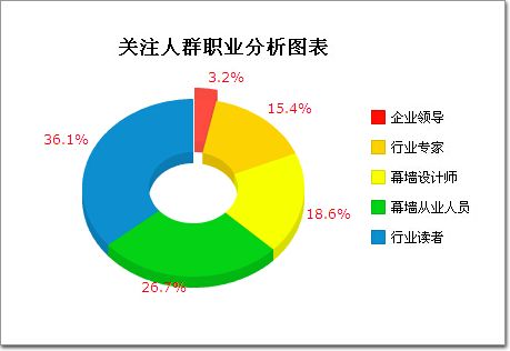中國幕墻網將門窗幕墻高級研討會的現場盛況通過專題的形式搬到到互聯網上,得到了很多業內人士的關注,他們包括:企業領導、行業專家、幕墻設計師、幕墻從業人員以及行業讀者。由上圖可以發現,行業讀者是占比最多的人群,占到總人數的36.1%,這部分人群對互聯網的新聞及行業動態比較關注;其次是幕墻從業人員26.7%,這部分人群通過高級研討會了解幕墻行業發展動態以及全國各地幕墻工程情況;幕墻設計師和行業專家比較平均,分別是18.6%和15.4%,這部分人群屬于高學歷技術人員,他們專注于幕墻工程的設計以及幕墻工程的探究,通過高級研討會了解更多這方面的實時動態;企業領導占比略少,占總人數的3.2%。