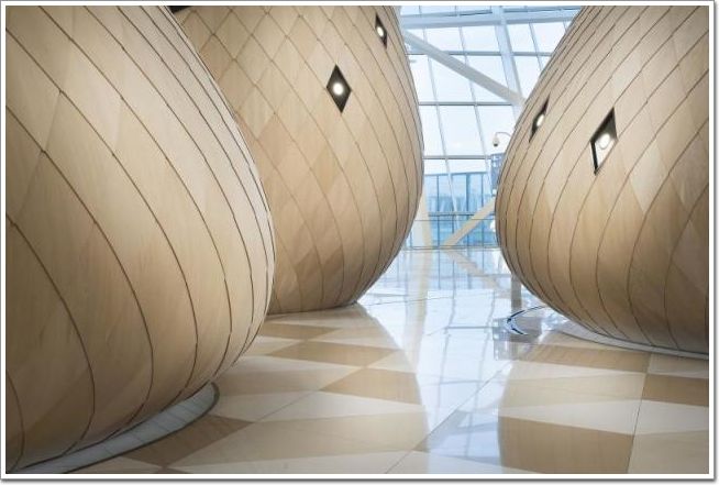 不銹鋼與玻璃材質(zhì)運(yùn)用在航站樓中通常意味著高效、快速的流通,但總讓人感覺少了些許人情味,而在阿塞拜疆首都巴庫的蓋達(dá)爾·阿利耶夫國(guó)際機(jī)場(chǎng),每年有 600 萬人次的旅客會(huì)穿過新航站樓的玻璃氣泡外殼,再飛向世界各地,土耳其建筑工作室 Autoban 從海綿體內(nèi)的微架構(gòu)中得到啟發(fā),用巨型的木“繭”讓這個(gè)冷冰冰的地方變得更有溫度。