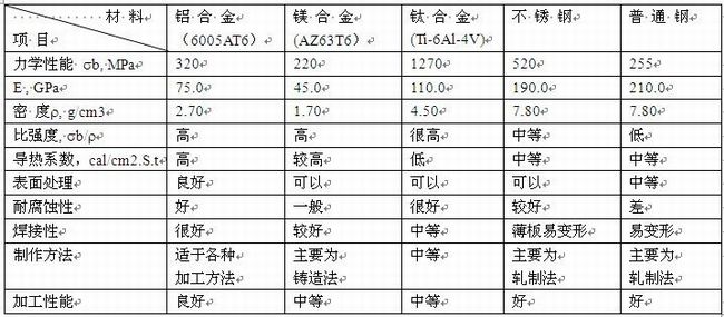 通常把密度(詞條“密度”由行業大百科提供)r?4.5g/mm3的金屬叫輕金屬,用輕金屬制造的合金稱之為輕合金。將輕金屬及其合金經鑄造(包括壓鑄(詞條“壓鑄”由行業大百科提供))、塑性成形或其它方法(如泡沫法、復合法、半固態成型法等)制成的材料稱為輕合金材料。輕合金材料具有一系列的優越特點,使之成為國防軍工、國民經濟各部門及人民生活各方面的重要基礎材料,特別是現代交通運輸的理想材料,其主要特性指標見表1,其優越特性如下: