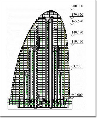T3塔樓較高核心筒主要墻體厚度為800~500mm,較低核心筒主要墻體厚度為600~500mm,混凝土強度等級為C60~C40。核心筒外墻角部、洞邊及片墻端部埋設(詞條“埋設”由行業大百科提供)型鋼(詞條“型鋼”由行業大百科提供)柱,靠近“魚尾”筒體在17,31,32,37,40層存在豎向收進,靠近“魚頭”筒體在17,41層存在豎向收進。