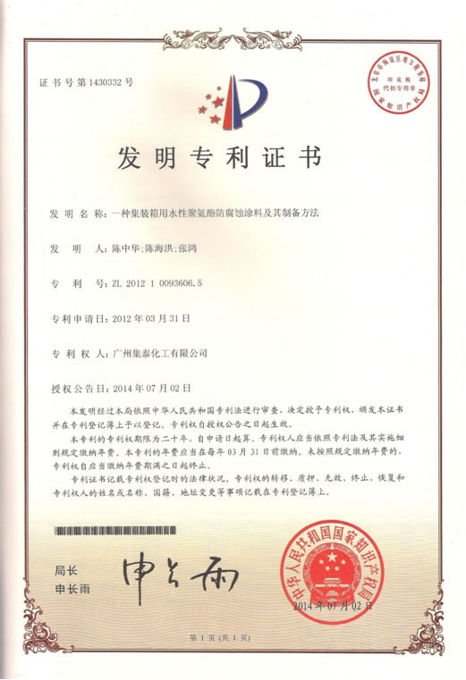 獲得授權的一項發明專利為一種集裝箱用水性聚氨酯防腐蝕涂料及其制備方法(專利號:ZL201210093606.5)。該發明提供了一種集裝箱用單組分水性聚氨酯防腐涂料的制備方法,制備出環保、高效的水性方法涂料,以替代傳統的溶劑型方法涂料,解決其有機溶劑的揮發引起的環境污染和影響施工工人健康等問題。該產品克服現有溶劑型和水性集裝箱涂料的缺點,環保無毒,施工簡便,性能優異,具有廣闊的應用前景和市場價值。
