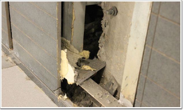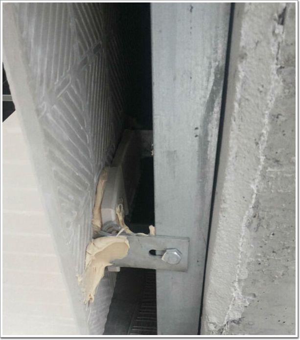 背面采用結(jié)構(gòu)類膠粘接(L形式的懸挑干法掛件,為了墊平粘接還增加打碎瓷磚)