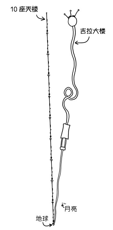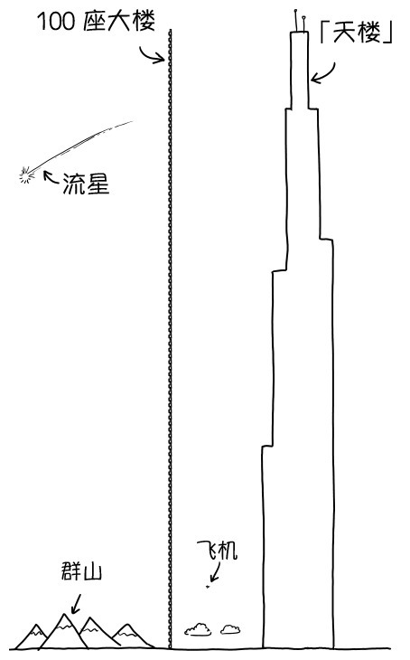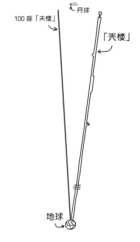好,我們把100座這樣的「大樓」疊成個「天樓」,樓頂還差一半就能到外太空了。