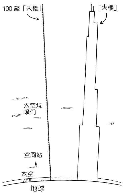 這「夫樓」坐地捅天,太空飛船一不留神就會撞上去。如果樓里的人看到國際空間站要來貼臉,你可以朝它丟個土豆讓它閃開。當然,每次都要緊急避險,空間站的宇航員可能被搞毛了,朝你吐個口水啥的。不過更糟糕的是,太空是個大垃圾場,充滿了各種的無意或故意產生的太空垃圾在亂飛,這樓估計會被撞的千瘡百孔。
