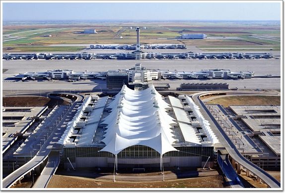 丹佛國際機(jī)場(chǎng)高聳的白色玻璃纖維屋頂在營造科羅拉多冰雪景觀的同時(shí)還能產(chǎn)生大量的太陽能。