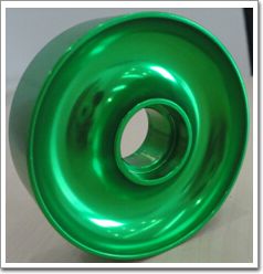 按照表1和表2中鋁合金成分進行配料、鑄棒,在相同的工藝條件下擠壓生產(chǎn)成φ81的擠壓棒材,然后機加工,外徑車削到φ80,端面用成型刀具加工成輪轂形狀,中心打通孔 φ17,鏜孔到φ17.5。加工好的半成品再進行染色陽極氧化(詞條“氧化”由行業(yè)大百科提供),氧化工藝與其它料的區(qū)別在于前處理只做酸洗除油不進行堿蝕,因為堿蝕后金屬表面的自然光澤就會消失,導致表面產(chǎn)生霧狀的效果,不光亮。