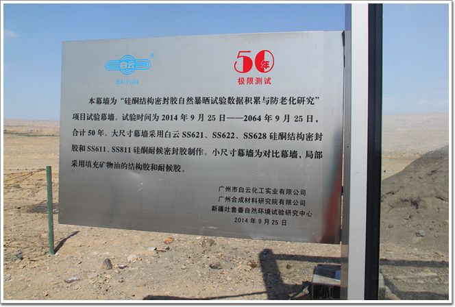 2014年9月25日,“硅酮結構密封膠(詞條“硅酮結構密封膠”由行業大百科提供)自然暴曬試驗數據積累與防老化研究”項目試驗幕墻于新疆吐魯番自然環境試驗研究中心正式落成。試驗幕墻將在這個坐落于著名火焰山腳下的“火州曬場”接受長達50年的自然暴曬。