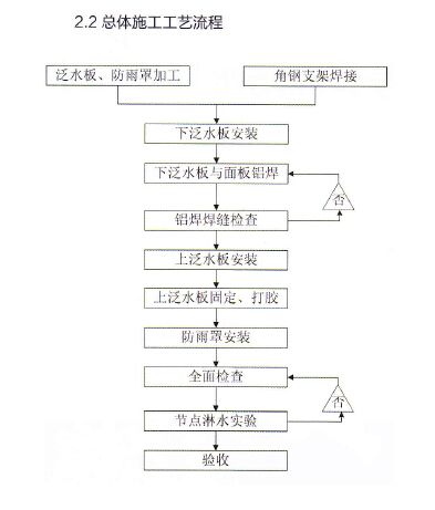 為保證泛水板與屋面板焊接(詞條“焊接”由行業大百科提供)質量,選用與屋面板材質相同的鋁鎂錳合金板材作為泛水板材料。用L30×3角鋼制作角鋼支架,焊接在鋼柱上,分別支撐在下泛水板折角(90度)處及焊縫處,作為下泛水板和焊縫處的支架。注意迎水面支架安裝標高(詞條“標高”由行業大百科提供)略高于背水面,保證迎水面不積水。