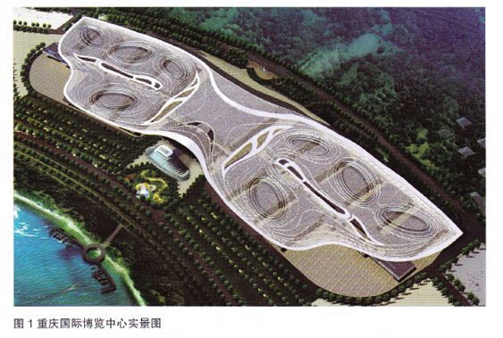 重慶國際博覽中心項目位于重慶市渝北區悅來鎮陽光社,整個項目規劃區平面呈帶狀,北東一南西向展布,外形為一只展翅欲飛的蝴蝶(見圖1)。整個建筑東西寬約800m,南北長1500m,總占地約1.3km2,由展館區、 酒店、多功能廳、會議中心、商業(及庫房)區等五部分組成,總建筑面積約為60萬m2。