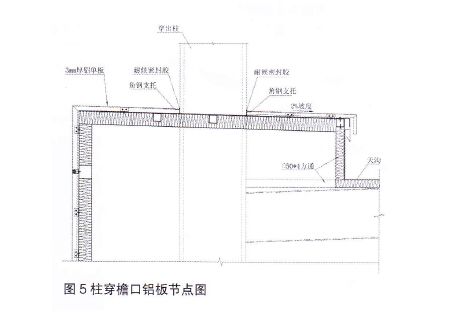 3.1.2為保證檐口處的整體美觀性,檐口位置樹杈柱穿鋁單板處防水節點打耐候密封膠處理(見圖5)。具體做法是:在柱上焊接角鋼支托保證2mm厚鋁單板在此處不會存在變形,鋁單板邊緣與樹杈柱外皮預留5~8mm間隙,在間隙處打耐候密封膠。為保膠的密封性,要求打膠高度不得小于5mm,打膠寬度不得小于15mm。