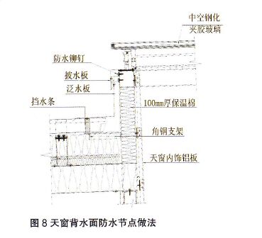 天窗防水節點工藝原理大體與穿屋面鋼柱防水節點相同,均采用兩塊異性泛水板將天窗周邊包住。天窗迎水面下泛水板與屋面板鋁焊連接,其他三面采用角鋼支架將雨水引流至完整的400mm寬板跨內。上泛水板插入玻璃鋁型材骨架內,并使用內后密封膠完仝密封。在上方加防雨罩保證防水效果。