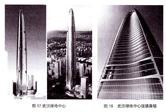 武漢國際金融中心,即武漢綠地中心,高度606m,125層。平面為圓角三叉形,豎向逐漸內收呈圓滑曲線(圖17)。立面上開有喇叭形洞口,可以減少主體結構(詞條“主體結構”由行業大百科提供)和幕墻所受的風力(圖18)。