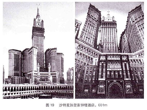 沙特阿拉伯麥加皇家鐘樓酒店高度601m。2010年建成。幕墻采用玻璃金屬和石材(圖19)