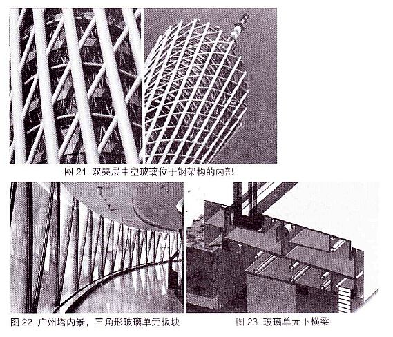 廣州塔高度600m,玻璃幕墻高度460m(圖32、圖33)。明框玻璃幕墻采用三角形單元板塊,尺寸為1500mmX3500mm。雙夾層半鋼化中空玻璃,(8mm+1.52mmSGP+8mm)+12mmA+(8mm+1.52mmSGP+8mm)(圖20~圖23)。