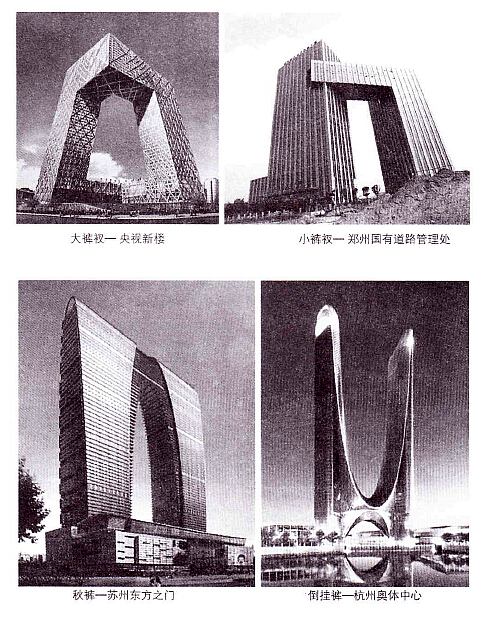 幾座建筑通過空中的連接體連接為一個整體,宛如一座空中橋梁,這就是連體建筑的特點,這當中有被網友稱之為“褲子系列”的幾座著名建筑,它們都采用了玻璃幕墻(圖26)。