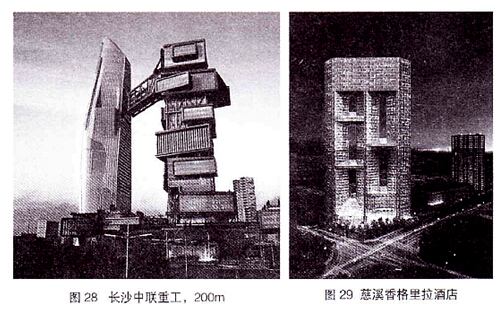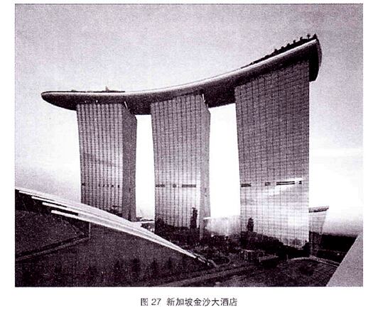 新加坡金沙大酒店由六座建筑兩兩相連為三個人字形后,再通過360m廠的空中花園連為整體;而長沙的中聯重工大樓和浙江慈溪香格里拉大酒店則有著獨特的立面效果(圖27~圖29)。
