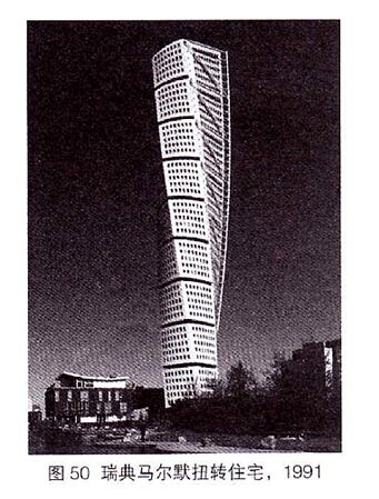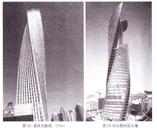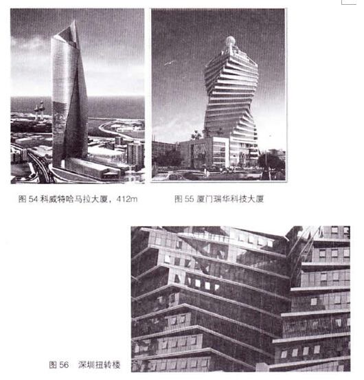 扭轉建筑最早出現在瑞典,這座高層住宅樓給人留下深刻的動感形象(圖50),此后扭轉樓便在各地興建,其中最為有名的是加拿大多倫多的夢露大樓,模仿好萊塢明星瑪麗蓮夢露的優美舞姿維肖微妙(圖51⒈ 圖52迪拜無限塔和圖54科威特哈馬拉大廈具有明顯的扭轉雙曲面,幕墻施工難度很大,均由我國的幕墻公司完成。我國在廈門和深圳也建成了類似的扭轉大擻圖55、圖56)。