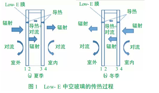 與普通單片玻璃相比,一方面,由于中空玻璃具有導熱系數較低的充氣層,可以增加玻璃傳熱阻抗,減小總的熱傳導,降低傳熱系數(詞條“傳熱系數”由行業大百科提供)(U);另一方面,由于中空玻璃其內部氣體處于一個封閉的空間,氣體不產生對流,而且氣體的導熱系數很低,因而對流和傳導在中空玻璃的能量傳遞中占的比例較小,而輻射傳熱則是影響中空玻璃節能的重要因素。與普通玻璃0.84的輻射率相比,Low- E 玻璃的輻射率只有0.15 或更低,使用Low- E 膜玻璃替代普通中空玻璃,可以極大地降低玻璃的輻射傳熱,進而降低中空玻璃的傳熱系數。