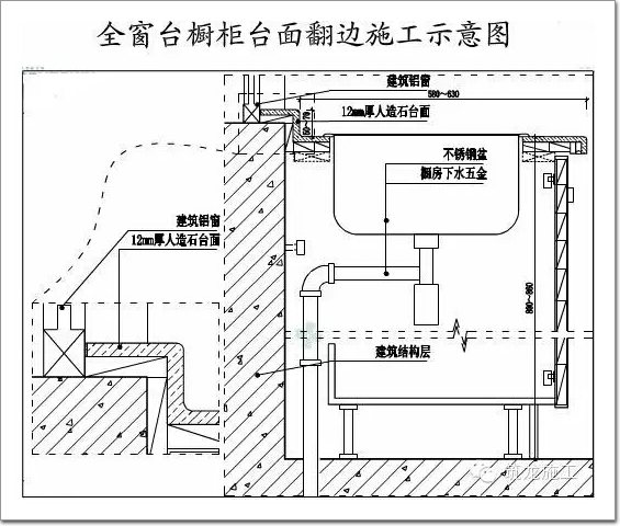 (1)窗臺部位低于人造石臺面板,人造石臺面擋水做出后需跟至窗邊或預留。