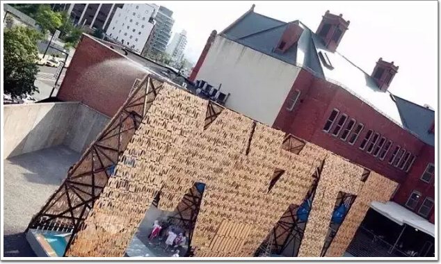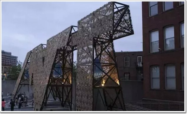 由studio CODA建筑事務所完成的“滑板碎片”幕墻亮相2013年美國現代藝術博物館音樂節,并成為最大的關注對象。整面幕墻都是由滑板木片殘余構成,呈空隙狀分布的幕墻非常適合音樂節這樣的靈動性場所,因為這里聚集著大量的流動游客,這里通常會設有可拆卸的木質桌椅已經為行人提供遮蔭避暑的小型廣場。studio CODA建筑事務所充分發揮他們的奇思妙想,并取材當地進行設計。而正是這樣的設計再一次向世人證明了:任何看似不可能的用材在一個富有創新性建筑師的筆下,都可以成為曠世之作的源泉和靈感。巨大的幕墻下面還設有噴泉池,巨大的泉水穿過幕墻的空隙灑落在人們的身上,增添了一份節日的活躍。