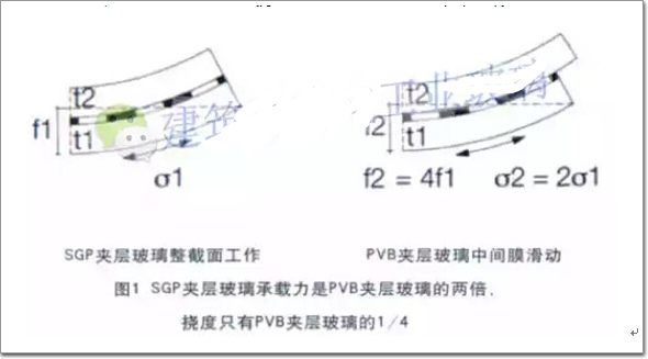SGP的剪切模量是PV13的50倍以上,撕裂強度比PVB高5倍。SGP夾膠后,玻璃受力時兩片玻璃之間的膠層基本上不會產生滑動,兩片玻璃如同一片等厚度的單片玻璃整體工作。這樣一來,承載力就是等厚度的PVB夾層玻璃承載力的2倍;同時,在相等荷載、相等厚度的情況下,SGP夾層玻璃的彎曲撓度只有PVB夾層玻璃的1/4(圖1)。
