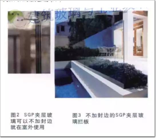 邊部穩定性指夾層玻璃邊部外露于大氣條件下的耐久性(詞條“耐久性”由行業大百科提供)。PVB夾膠不耐潮濕,水汽作用下容易開膠、分離,要求外露邊緣進行封邊處理。而SGP膠膜有良好的邊部穩定性,對水分不敏感,在外露條件下使用也不會升膠、分離,可以開邊使用,不必封邊(圖2)。所以SGP夾層玻璃可以很方便地用于攔板、雨棚、外挑裝飾玻璃翅、玻璃遮陽板等外露邊緣的構件而無須采取專門的封邊措施〔圖3)