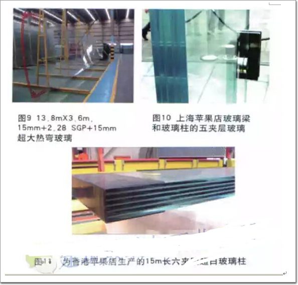 目前,國外生產的熱彎(詞條“熱彎”由行業大百科提供)鋼化夾層玻璃最大長度為6m。我國于2010年成功生產了世界上第一塊超大尺寸玻璃:12.8m X 2.6m熱彎鋼化超白夾層,15mm+2.28SGP+15mm(圖7)。接著,生產了12塊12.6mX2.6m超大尺寸熱彎鋼化夾層玻璃,12mm+1.58SGP十12mm+1.58SGP+12mm,用于上海蘋果店(圖8)。