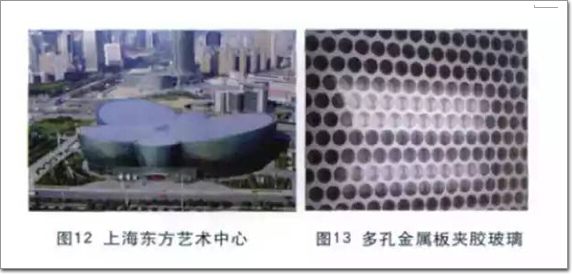 SGP中間層夾層玻璃己經在許多大型公共建筑中應用。圖12為上海東方藝術中心,幕墻玻璃采用兩塊玻璃夾一層多孔金屬板(圖13),只有SGP強力粘接(詞條“粘接”由行業大百科提供)才能完成金屬板夾膠玻璃的制造。SGP夾層玻璃在公共建筑中應用,提高了幕墻的安全性,減輕了玻璃的自重,而且使幕墻更為通透。