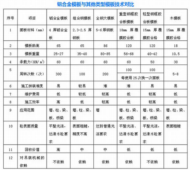 與此同時,隨著我國勞動力成本特別是擁有木工基礎(chǔ)的建筑工人工資成本迅速增加,尋求解決建筑業(yè)用工量大、招工難、效率低和粗放型的施工方法、節(jié)能減排、降低施工成本也成為建筑企業(yè)的當(dāng)務(wù)之急。在此背景下,一種強度高、施工周期短、重量輕、結(jié)構(gòu)簡單、精度高、施工方便、新型、理想的綠色建筑材料——鋁合金模板在南方沿海地區(qū)也悄然興起。通過收集資料,我們對鋁合金模板與其它類型模板的技術(shù)和性價比作了對比,見下表: