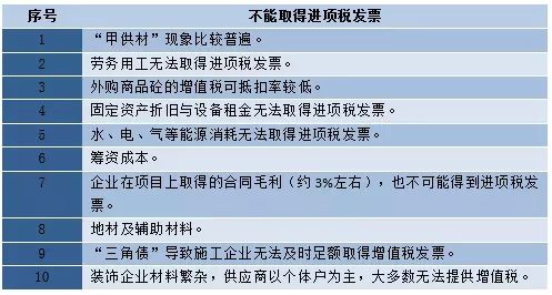 據調查,問題的關鍵在于理論上可取得進項稅發票的部分約占總收入的70%,而實際上這個數據是35%,加上理論上也無法取得進項稅發票的部分占總收入的30%,即實際上無法抵扣進項稅的支出占總收入比重達65%左右。不能取得進項稅發票的主要原因有以下10個方面: