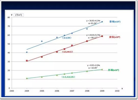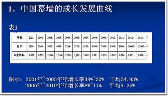 問題是時代的格言,這是馬克思的講的,所以你的改造,你的問題,你的創新等,都需要尋找問題,所以我提了一個幕墻問題和問題幕墻,幕墻問題,是講我們行業的問題,問題幕墻,是講個體、單項。為了發展,要尋找問題,要尋找發展中的問題。前兩個五年計劃中間的幕墻的發展,每年以35%左右的增長,但是后來有拐點了,這個數據,也是核實過的,這是兩個幕墻公司上市的時候,招股書里面寫的,是真的。另外,我也用各種方法,測定這個數據基本正確,因為如果有一個錯誤的數據,比沒有數據還糟糕。所以這個紅線是我畫的,藍線是發展,中國這么大,體量還是很大的,但是年增長率有拐點。