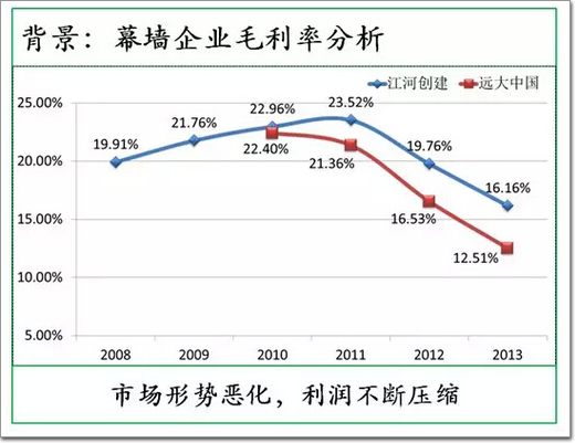 最后后再看幕墻行業,從產值來看,老大,遠大(藍線),老二,江河(紅線),從2011年起,開始下降了,因為兩家都是上市公司,這個數據絕對是真實有效的。業內的同仁都知道,如果一個幕墻公司,它的毛利在15%以下,那他凈利潤就沒有多少了,所以整個行業面臨到一個高溫,快速擴張,到理性的,合理的發展階段,大家要有這樣一個概念,在這個時候,我們再看一看,我們應該做什么?