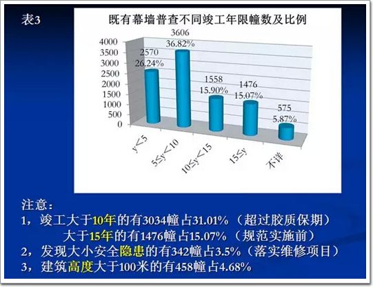 上海既有幕墻2013年9月份,進行了一次大普查,現場普查2012年3月到2014年9月,一共18個月,63個巡查組,164次專家參加,上海8個區既有幕墻總數9785幢,這是2012年到2013年這個階段,2014年12月普查是2239棟,它的分區,當然是浦東新區最多,其次是徐匯區,第三是楊浦區,然后是黃埔,普陀,每一個區的分布有大量的幕墻,對于我們下一階段既有幕墻的改造,提供了一個很好的地區分布。調查期間,竣工大于十年的有303幢,占35%,這就超過了建筑膠的質保期,并不等于十年以上就不行了,只是有這么一個界限,第二個,大于15年的,有1476幢,發現大小安全隱患的有342幢占3.5%,建筑高度大于100米的458幢,占5%左右。這就是上海既有幕墻的一個現狀,這個我首先要感謝163個人,參與的這一次調查,這個質量是比較真實的,基本可取。