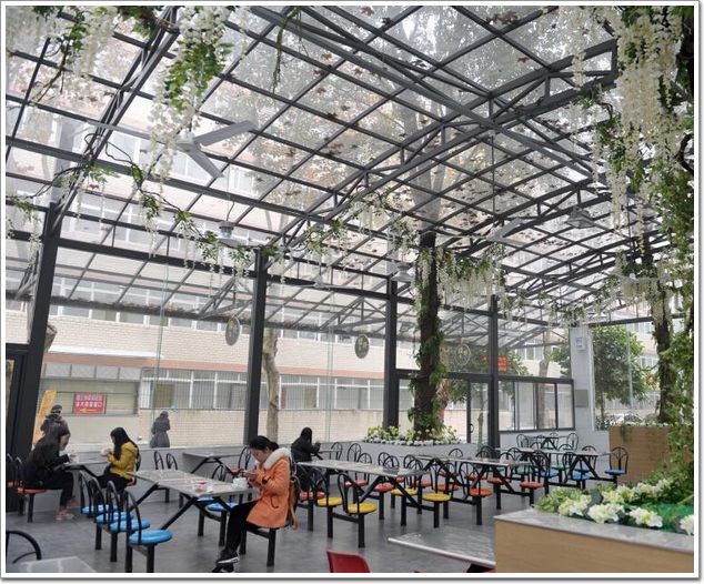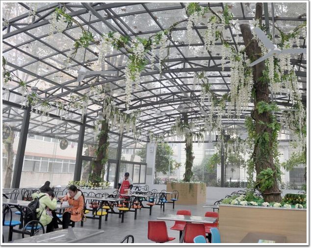 該餐廳用玻璃和鋼構架(明框玻璃幕墻)建造而成,通體透明,5棵直徑40多厘米的樟樹穿“破”屋頂,主干在餐廳內,枝條、綠葉則在餐廳外。樟樹主干上,還纏有槐花、藤蔓、綠葉等裝飾,一派綠意盎然的景象。餐廳面積近300平米,可同時容納200多人。餐廳原址是一片樹林,考慮到采光、保護樹木、氛圍營造等因素,學校幾經商量,決定把餐廳打造成森林系風格。施工方介紹,最難的部分是讓樟樹穿過屋頂。前后實驗了幾次,最終采取了給玻璃挖洞,把玻璃破開后夾住樹干,再把玻璃黏住用薄膜(詞條“薄膜”由行業大百科提供)覆蓋的方式。如此一來,既保護了樹木,又利用了樹木。這樣的作法,讓門窗幕墻行業的專家們感到汗顏……