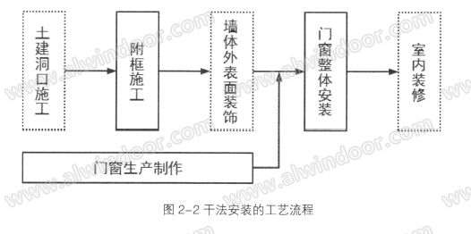 a)JGJ214— 2010《鋁合金門窗工程技術規范》中。干法安裝定義:墻體門窗洞口預先安置附加金屬外框并對墻體縫隙進行填充、防水密封處理,在墻體洞口表面裝飾濕作業完成后,將門窗固定在金屬附框上的安裝方法。