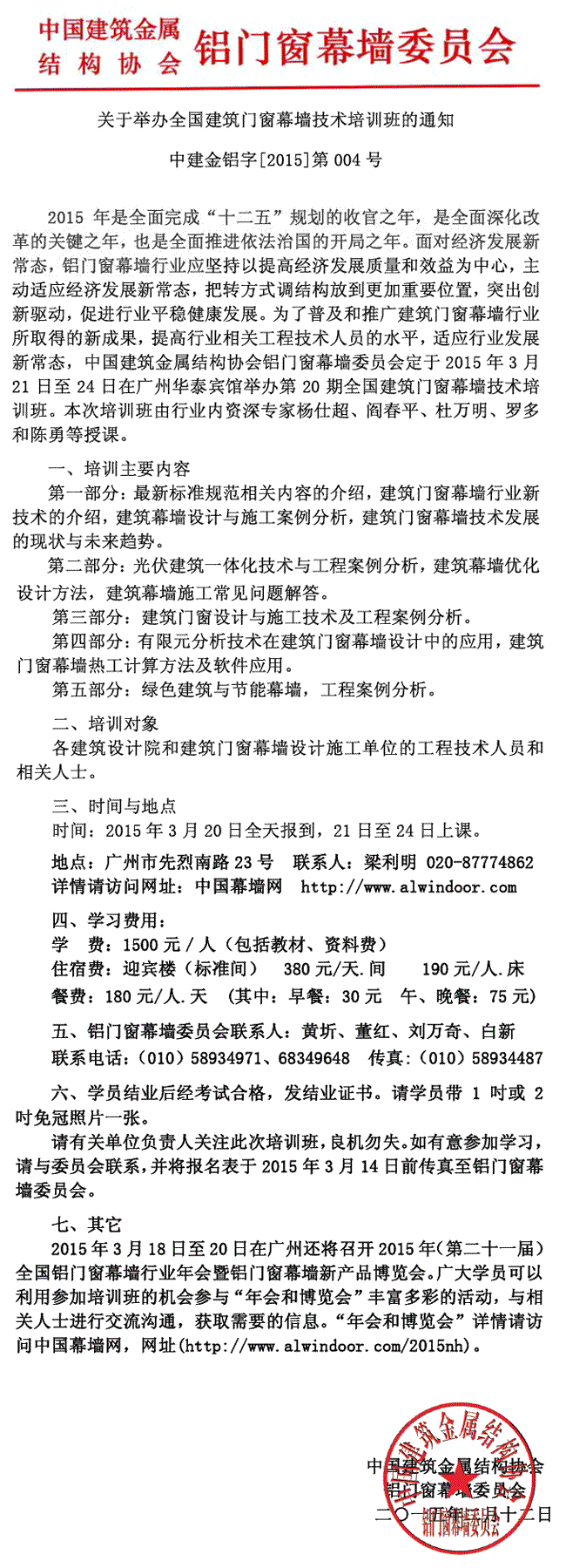 第20期全國建筑門窗幕墻技術培訓班日程安排