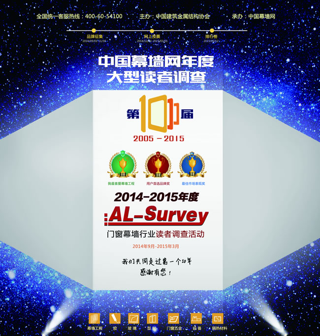 今年舉辦的調查,剛好迎來了她的十周歲生日。作為活動承辦方和發(fā)起者——中國幕墻網,與二十多家合作媒體的強強聯手,通過調查活動的排行榜和分析報告,日漸成為廣大讀者,消費者、采購者獲取權威品牌選用、采購指南的風向標。同時也為廠家的市場策略及宏觀的行業(yè)發(fā)展研究,提供了精準的參考數據。調查活動,將在3月17日鋁門窗幕墻委員會年會期間頒獎。>>>>>點擊查看調查活動詳情