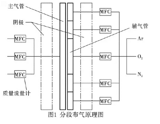 1)布?xì)夤苈贩譃橹鞴芎洼o管,主管由3個(gè)質(zhì)量流量計(jì)分別控制Ar、O2、N2氣的供氣量,輔管根據(jù)陰極寬度分為3~7段,每段由一個(gè)質(zhì)量流量計(jì)單獨(dú)控制工藝氣體流量,見圖1。