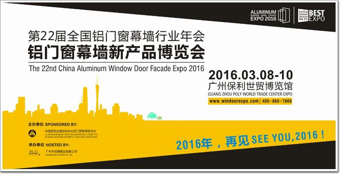 據悉,“第22屆全國鋁門窗幕墻新產品博覽會”定于2016年3月8 - 10日廣州保利世貿博覽館舉行。博覽會將更大力度地組織專業精英論壇、技術交流、新技術產品推介等豐富的活動,推進行業高端交流,促進行業發展,繼續為廣大參與者提供最優質、專業的服務。讓我們共同期待,明年更多精彩呈現!