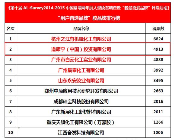 道康寧自去年11月入圍第十屆AL-Survey門窗幕墻大型讀者調查活動以來,倍受廣大行業讀者和用戶的青睞,通過三個多月的網上票選和專家評審,最終以4913票,榮獲用戶選擇獎第二名。