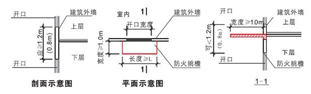 在建筑構造方面,新《建規》還規定:建筑外墻上、下層開口之間應設置高度不小于1.2m的實體墻或挑出寬度不小于1.0m、長度不小于開口寬度的防火挑檐。當室內設置自動噴水滅火系統時,上、下層開口之間的實體墻高度不應小于0.80m(圖7)。當上、下層開口之間設置實體墻確有困難時,可設置防火玻璃墻,但高層建筑的防火玻璃墻的耐火完整性不應低于1.00h,單、多層建筑的防火玻璃墻的耐火完整性不應低于0.50h。外窗的耐火完整性不應低于防火玻璃墻的耐火完整性要求(圖8)。