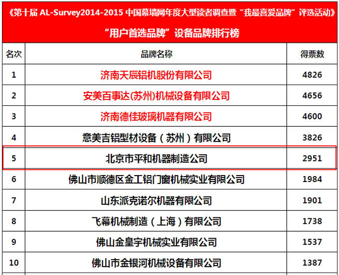 平和機(jī)器自去年11月入圍第十屆AL-Survey門窗幕墻大型讀者調(diào)查活動(dòng)以來,倍受廣大行業(yè)讀者和用戶的青睞,通過三個(gè)多月的網(wǎng)上票選和專家評(píng)審:以4996票,榮獲市場(chǎng)表現(xiàn)品牌第1名;以2951票,榮獲用戶首選品牌第5名。
