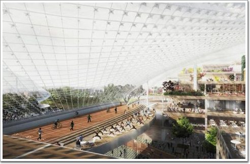 谷歌新園區規劃效果圖商業區:谷歌將建設公共的綠道(Green Loop)。這樣的環形道路將允許自行車和行人穿過大樓通行,而大樓的下方幾層可以是咖啡店和其他商店。 遮雨棚:谷歌將用這種反傳統的天花板來區分建筑物的內部和外部。