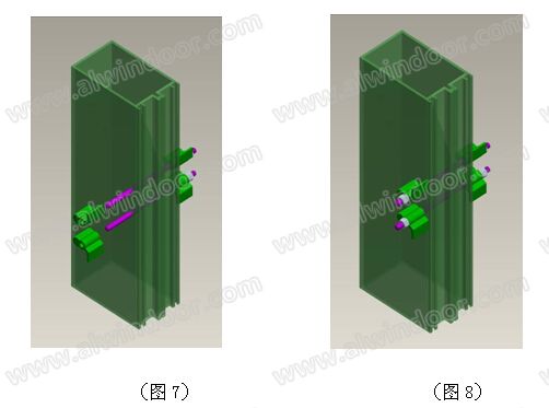 在立柱上橫梁連接位置加工出上下兩個孔,兩孔關于分格中心線對稱,將四個轉扣通過螺柱組件安裝于立柱兩側(見圖7、圖8)。