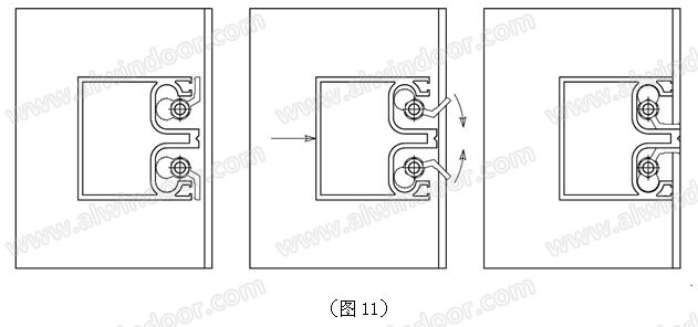立柱安裝調試完畢后,將橫梁由室內方向往外平推,使其槽口卡入轉扣中,并同時轉動轉扣將橫梁卡住。(見圖9、圖10、圖11)。