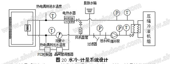 水冷-計量系統由吸收板、冷卻板、水循環系統、制冷系統、流量計等組成。吸收板和冷卻板安裝在計量箱內,吸收板為鍍有高太陽能吸收膜的金屬板,金屬板背部有多排連通水管,與箱體外部的循環水相連通,用于熱計量箱系統溫度的調節和計量。水冷-計量系統整體設計見圖20。