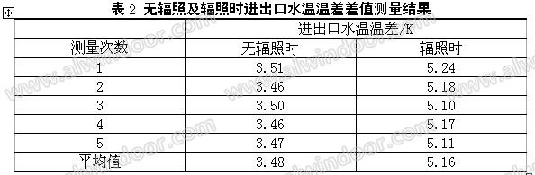 由表2可以看出,無輻照時進出口水溫溫差平均值為3.48K,輻照時進出口水溫溫差平均值為5.16K。則輻照前后水溫溫差差值為1.68K,熱量為: