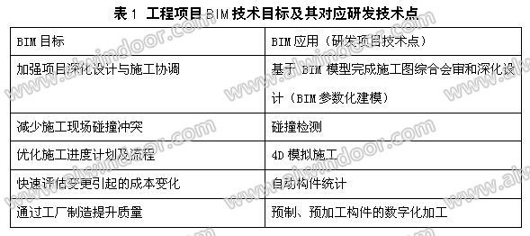 因此,幕墻施工單位有必要對公司原有的技術力量進行重新配置和整合,并制定針對性的項目設計及技術管理策略、技術路線以及項目實施辦法,以滿足該項目特殊需要,并制定了其幕墻BIM技術研發目標以及對應BIM應用,見下列表1所示: