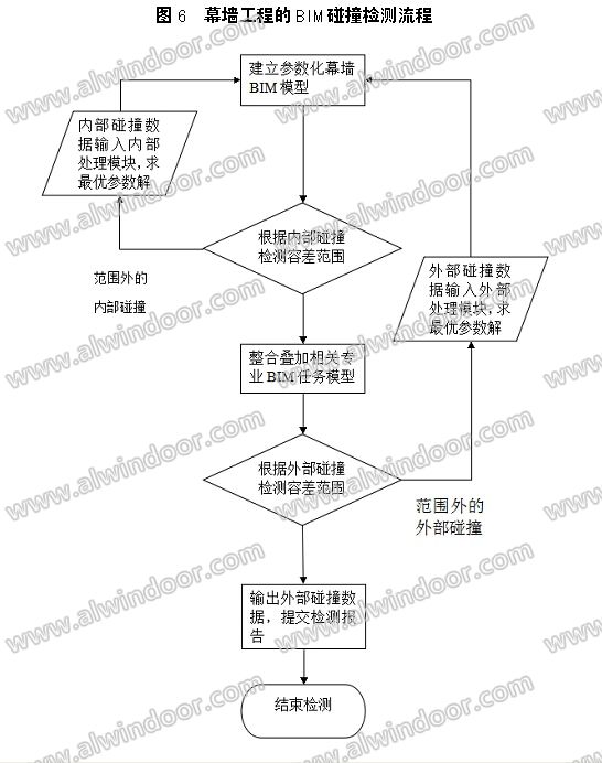 2)、根據(jù)檢測任務(wù)的需要,選擇幕墻系統(tǒng)內(nèi)不同的模型構(gòu)件、類型或范圍,對待檢模型進(jìn)行內(nèi)部碰撞檢測。檢測結(jié)果將提交程序進(jìn)行判斷:如碰撞數(shù)據(jù)的容許誤差在其限制范圍之外,則將其碰撞數(shù)據(jù)導(dǎo)入內(nèi)部處理模塊,模塊將運(yùn)算出其幕墻單元尺寸參數(shù)的最優(yōu)解,并返回步驟1),最優(yōu)尺寸參數(shù)的數(shù)據(jù)將輸入第一步的數(shù)據(jù)接口,對模型進(jìn)行修正及更新;如碰撞容許誤差在限制范圍內(nèi),則進(jìn)入流程的下一步。