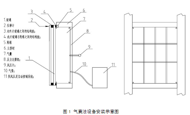 氣囊法檢測設備由氣囊(氣囊尺寸應與玻璃幕墻被測面板相同)、氣囊加壓裝置、壓力測量裝置及位移測量裝置組成。氣囊法檢測設備安裝示意圖如圖1。